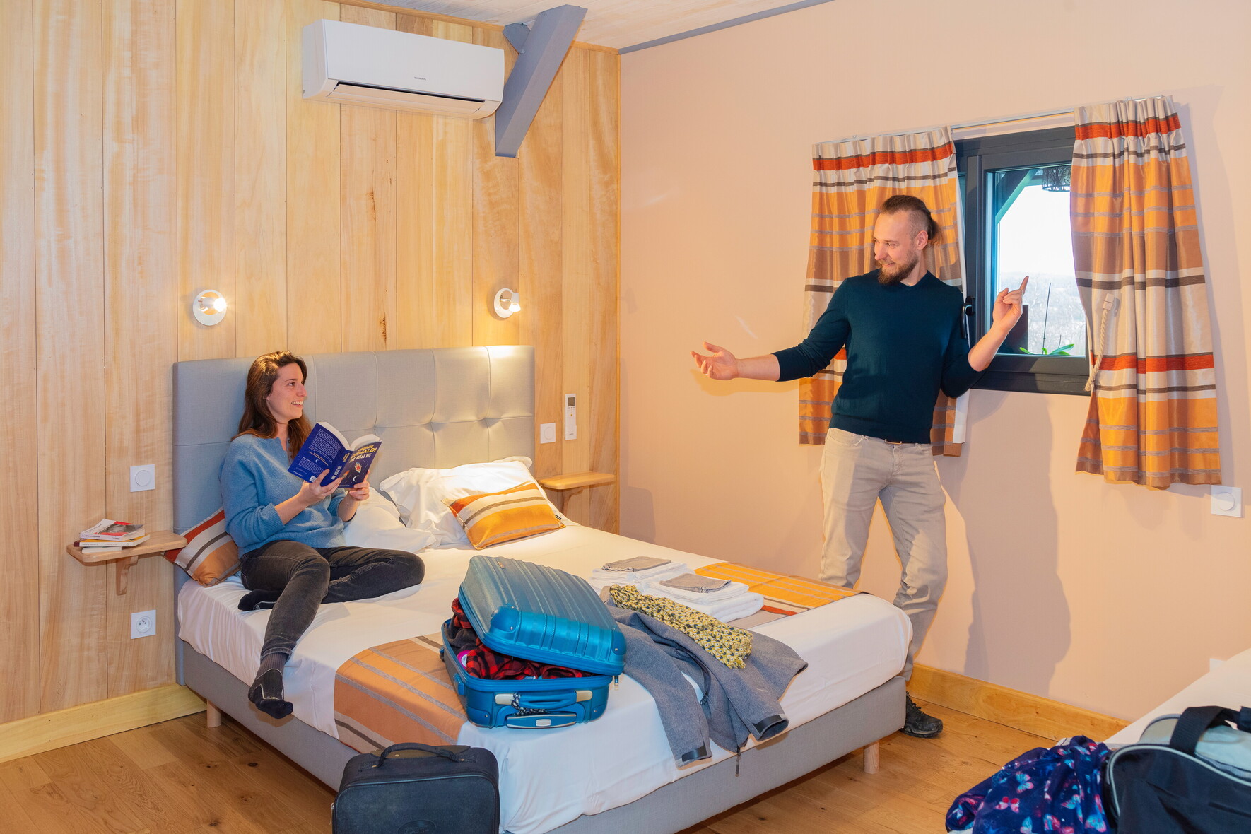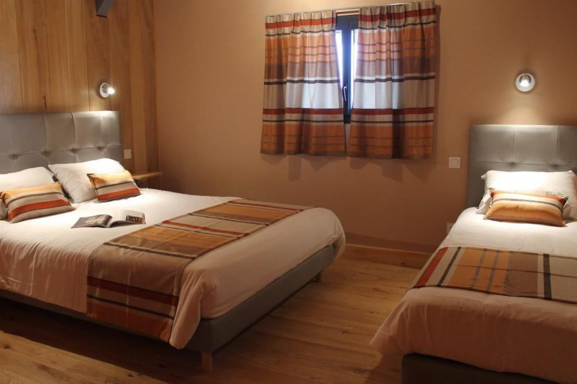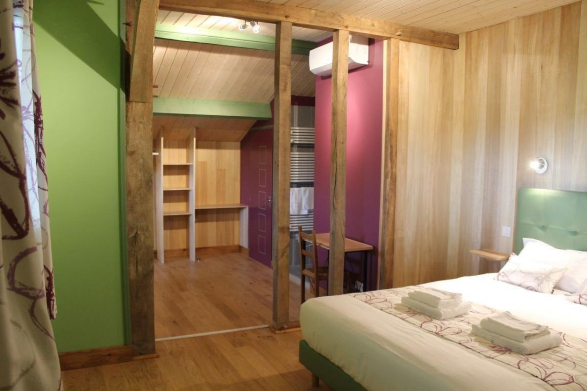 Toutes les chambres sont climatisées et disposent d’une salle d’eau et de toilettes privatives. 4 chambres à l’étage : Chambre Pêche Triple avec 1 lit 90 et 1 lit 160, fenêtre donnant sur coursive/salon. Ce salon baigné de lumière grâce à sa grande baie vitrée offre aux vacanciers des 5 chambres, détente (TV, livres…) et vue panoramique. Chambre Mirabelle Triple avec 1 lit 90 et 1 lit 160. Chambre Noisette avec 1 lit 160. Chambre Pomme Familiale avec 2 lits 160 et 1 lit 90. Au rdc : Chambre Prunelle avec 1 lit 160, accessible aux personnes à mobilité réduite.