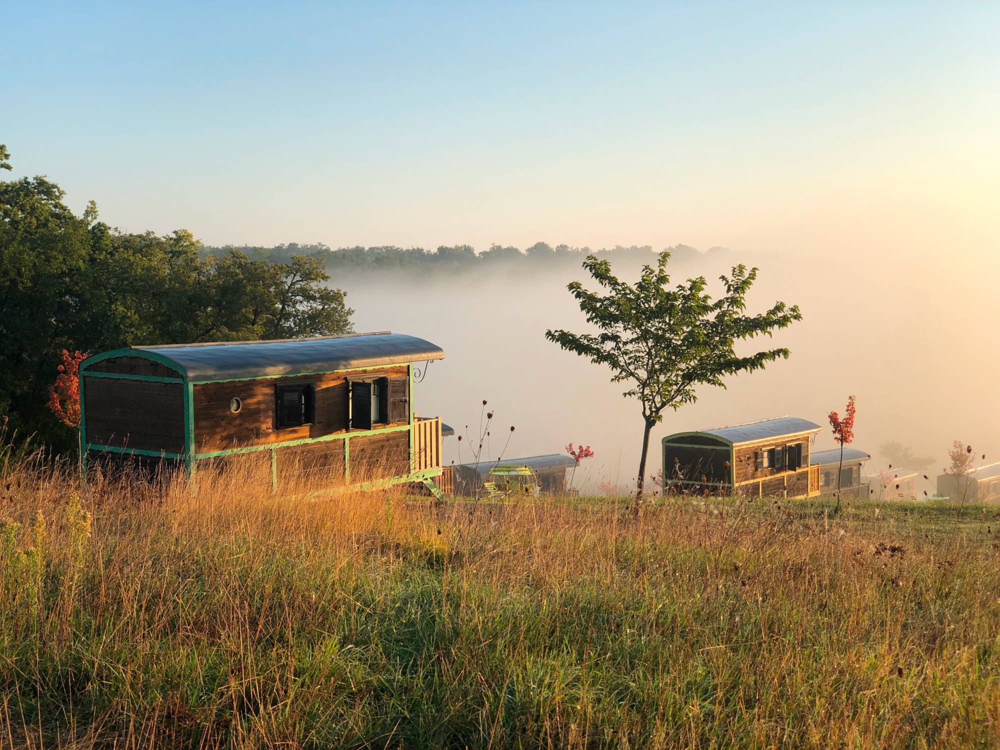 Installées à flanc de colline et espacées de 15 à 20 mètres, les roulottes garantissent calme, intimité et sérénité, dans un cadre propice au lâcher-prise et au ressourcement.