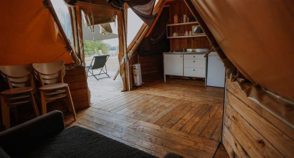 Érigé en toile et en bois, le lodge garantit intimité et confort avec ses trois chambres séparées. Il dispose de deux lits doubles (140 cm) pour les couples, ainsi que de deux lits superposés et d’un canapé-lit simple, pouvant accueillir jusqu’à 4 adultes et 3 enfants.
